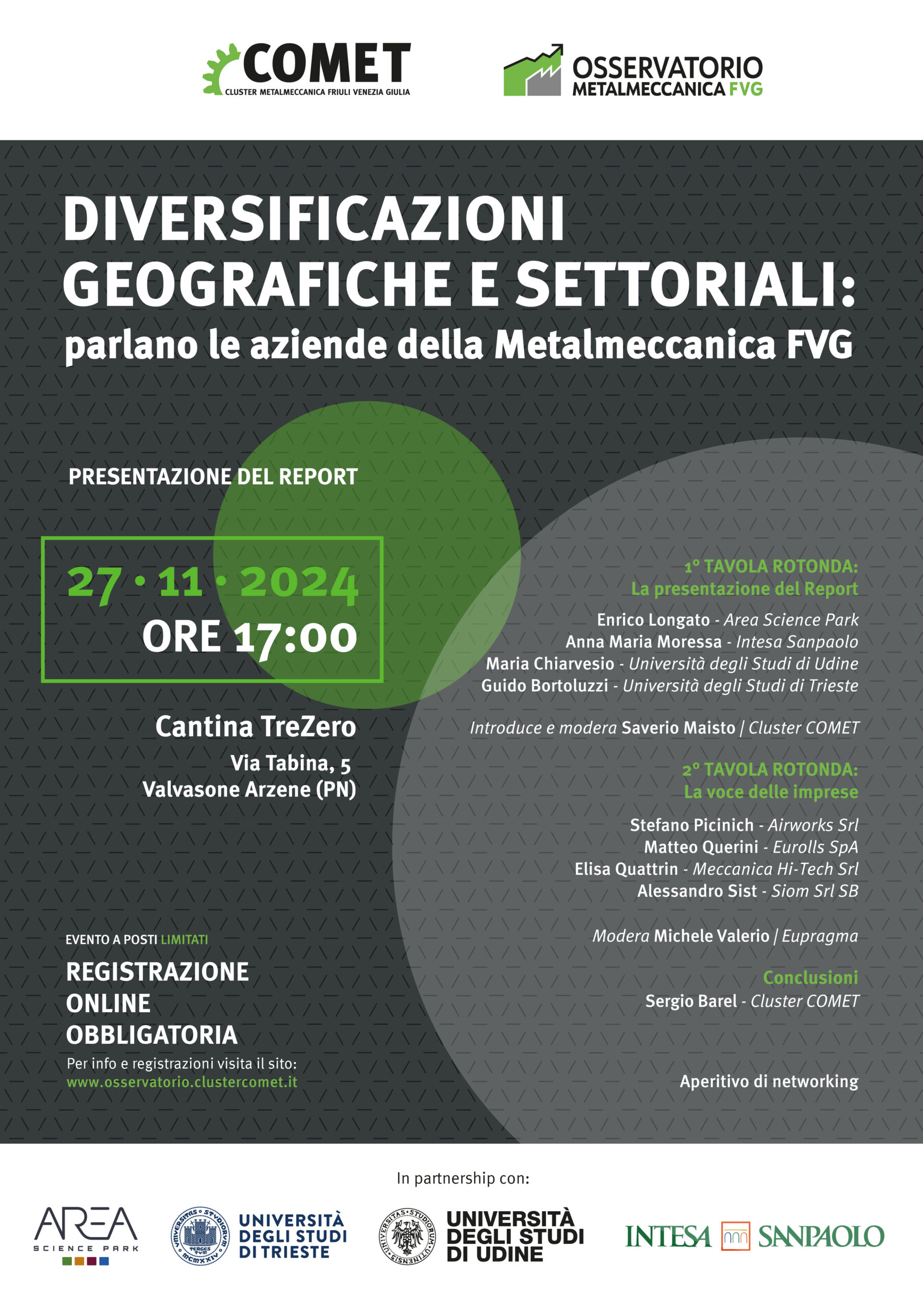 Osservatorio Metalmeccanica FVG, progetto nato e coordinato da COMET – Cluster della Metalmeccanica del FVG – che, insieme alla collaborazione dell’Università degli Studi di Trieste, Università degli Studi di Udine, Intesa Sanpaolo e Area Science Park, unisce per la prima volta differenti banche dati per monitorare ogni sei mesi il settore metalmeccanico in FVG.