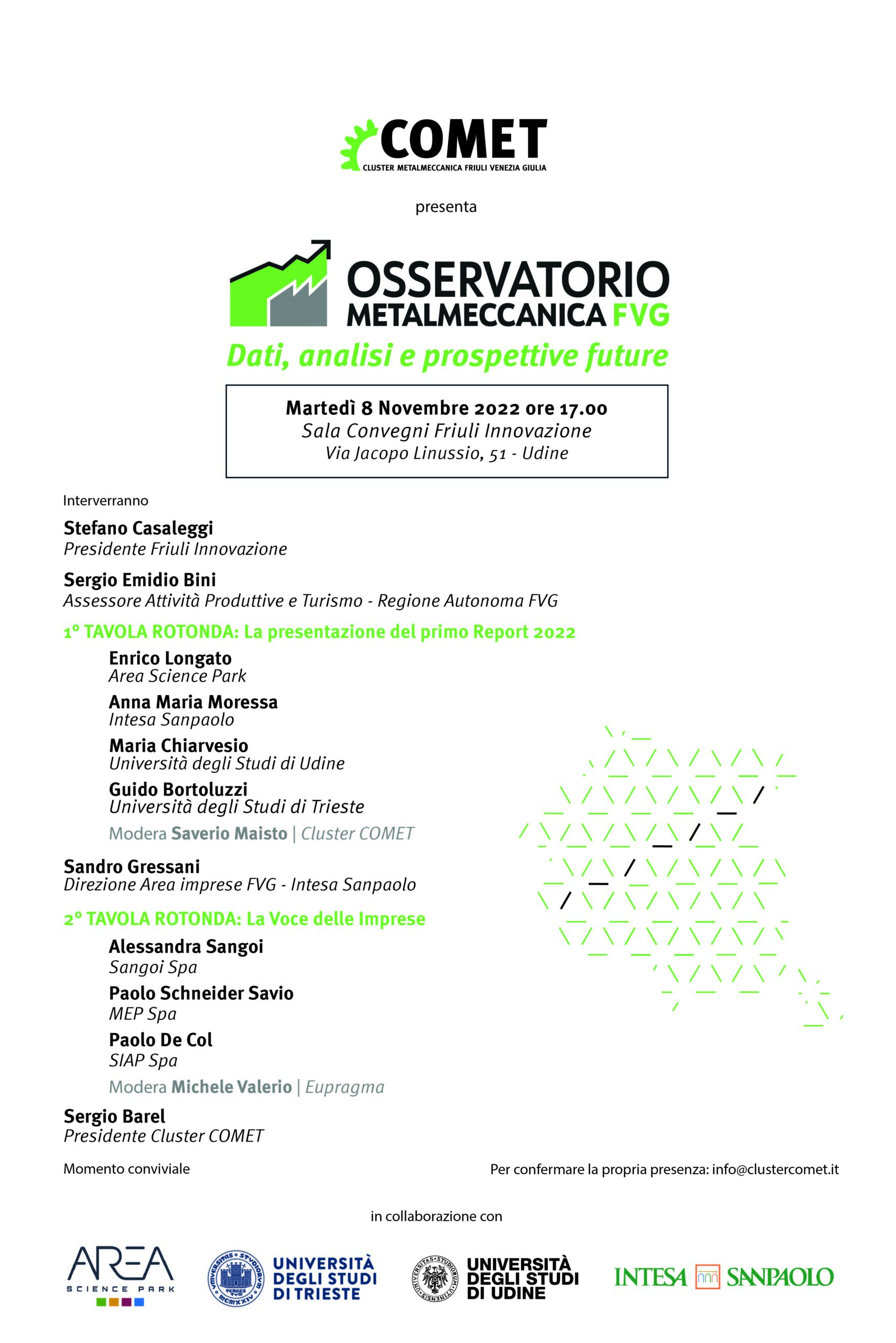 COMET vi invita all’evento di lancio dell’Osservatorio della Metalmeccanica FVG, progetto ideato e coordinato dal Cluster che unisce le più importanti realtà dal mondo delle imprese della Metalmeccanica FVG e della ricerca per riflettere insieme sul futuro del settore in Friuli Venezia Giulia.
