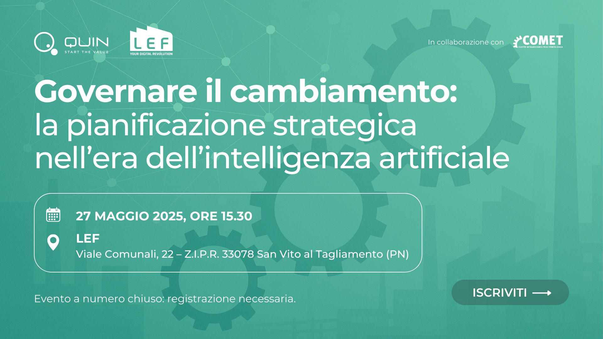 COMET segnala l’evento del 27 maggio alle 15:30 “Governare il cambiamento: la pianificazione strategica nell’era dell’intelligenza artificiale” che abbiamo organizzato in collaborazione con Quin presso Learning Experience Factory di San Vito al Tagliamento.